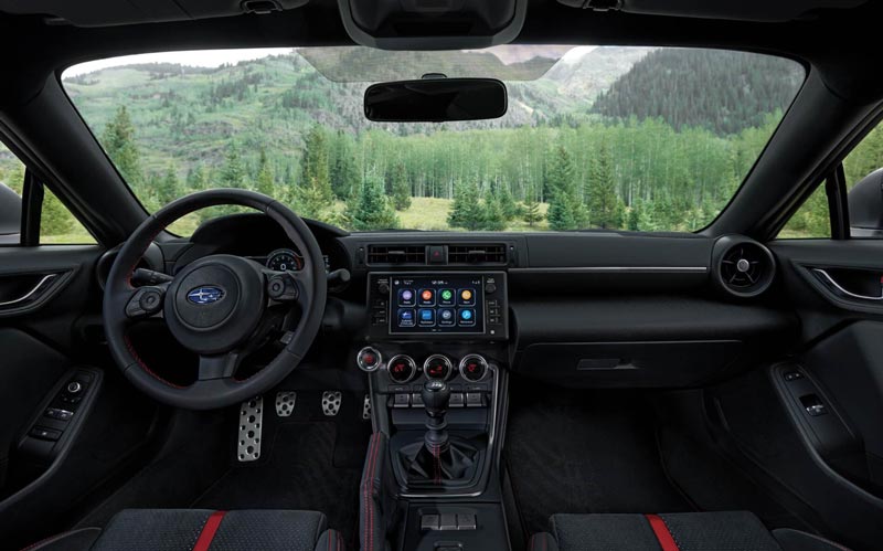 - Premium - The Premium is your base trim that gives you the BRZ engine with a standard six-speed manual transmission, but there is a six-speed automatic transmission available. If you choose the automatic transmission, you get the EyeSight suite of safety features with it. You also get LED lights, 17-inch alloy wheels, and a limited-slip differential. In terms of interior features, this trim offers you an 8-inch touchscreen infotainment, Apple CarPlay, Android Auto, Bluetooth, Cloth upholstery, push-button start, keyless entry, a leather wrapped steering wheel, and a rearview camera.Â