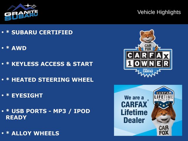 * SUBARU CERTIFIED, * AWD, * KEYLESS ACCESS & START, * HEATED STEERING WHEEL, * EYESIGHT, * USB PORTS - MP3 / IPOD READY, * ALLOY WHEELS.
