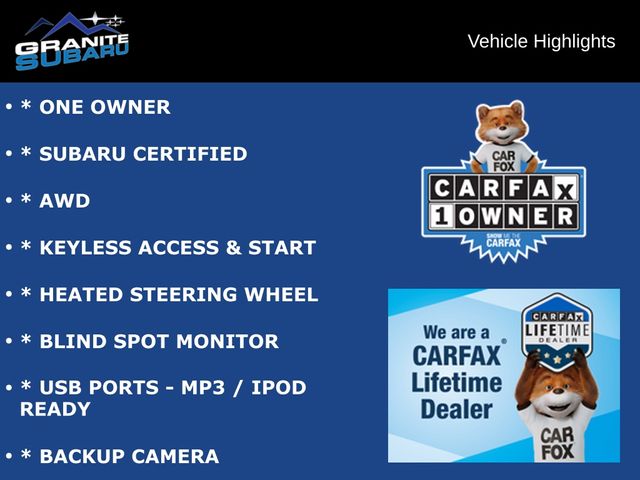 * ONE OWNER, * SUBARU CERTIFIED, * AWD, * KEYLESS ACCESS & START, * HEATED STEERING WHEEL, * BLIND SPOT MONITOR, * USB PORTS - MP3 / IPOD READY, * BACKUP CAMERA, * POWER REAR GATE, * ALLOY WHEELS.