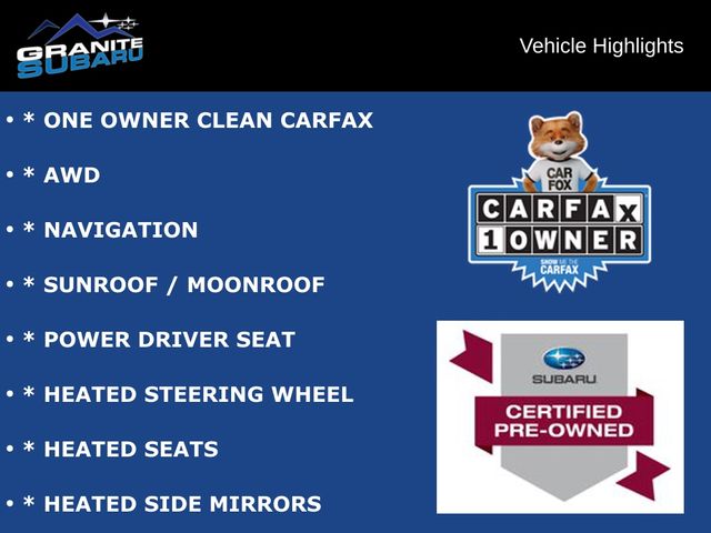 * ONE OWNER CLEAN CARFAX, * AWD, * NAVIGATION, * SUNROOF / MOONROOF, * POWER DRIVER SEAT, * HEATED STEERING WHEEL, * HEATED SEATS, * HEATED SIDE MIRRORS, * EYESIGHT, * BLIND SPOT MONITOR, * LANE DEPATURE W/ LANE CENTERING, * BLUETOOTH, * APPLE CAR PLAY / ANDROID AUTO, * BACKUP CAMERA, * ALLOY WHEELS.