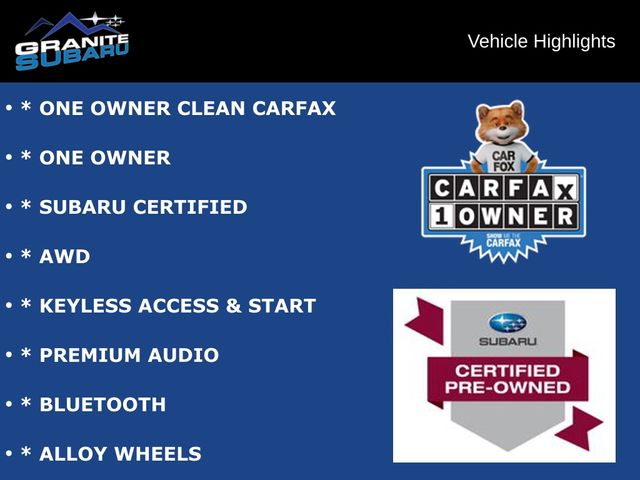* ONE OWNER CLEAN CARFAX, * ONE OWNER, * SUBARU CERTIFIED, * AWD, * KEYLESS ACCESS & START, * PREMIUM AUDIO, * BLUETOOTH, * ALLOY WHEELS.