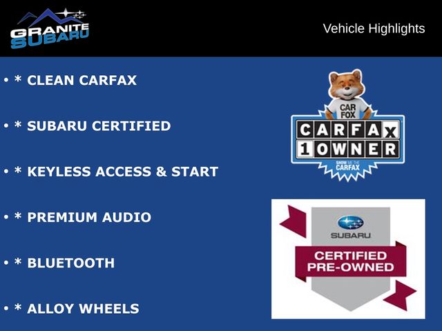 * CLEAN CARFAX, * SUBARU CERTIFIED, * KEYLESS ACCESS & START, * PREMIUM AUDIO, * BLUETOOTH, * ALLOY WHEELS.