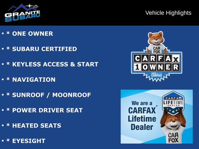 * ONE OWNER, * SUBARU CERTIFIED, * KEYLESS ACCESS & START, * NAVIGATION, * SUNROOF / MOONROOF, * POWER DRIVER SEAT, * HEATED SEATS, * EYESIGHT, * BLIND SPOT MONITOR, * PREMIUM AUDIO, * BACKUP CAMERA.